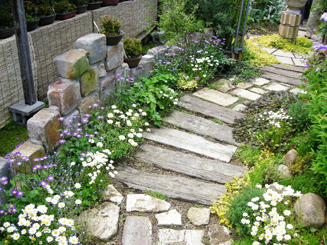 走在鋪著枕木的小徑,兩旁種著矮小植栽,